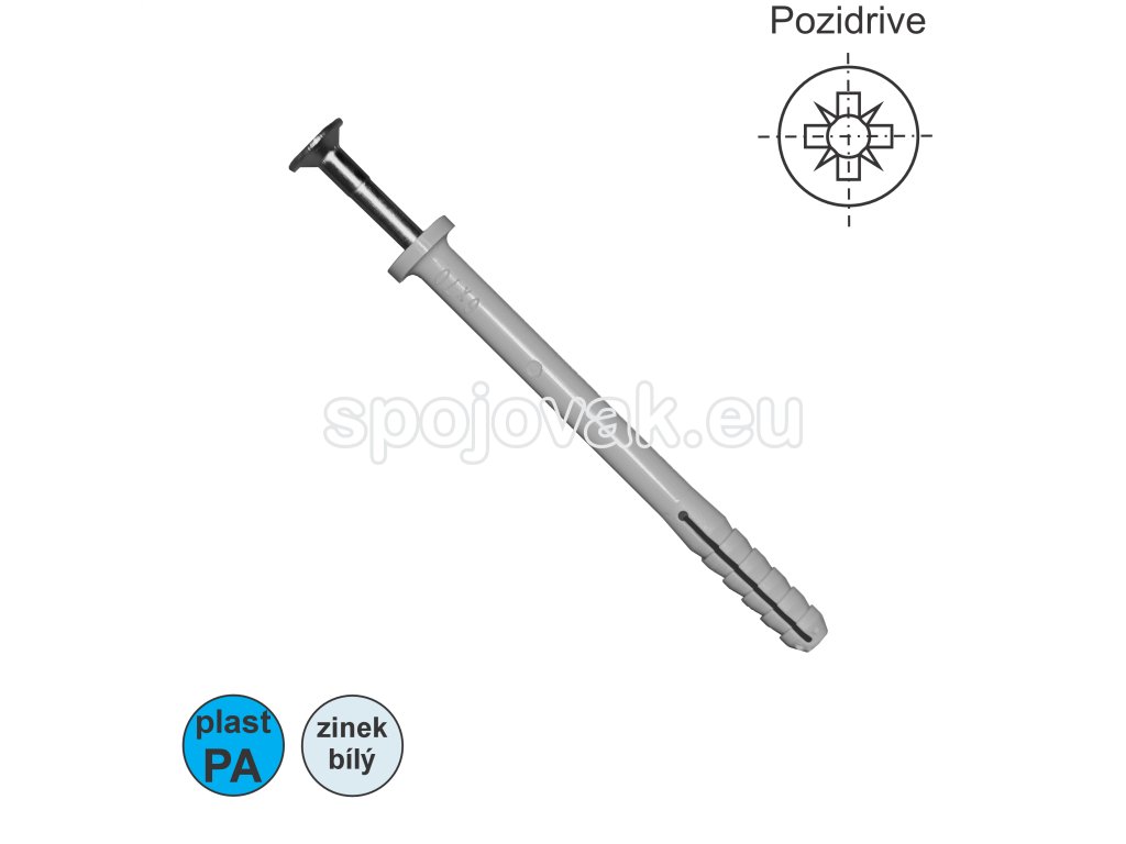 Hmoždinka pro použití do plných stavebních materiálů k upevňování latí, rámů, kovových profilů apod..