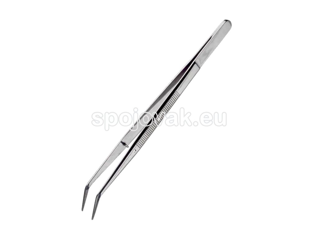 150 mm; pinzeta s jemnými,zahnutými a vroubkovanými špičkami a vroubkováním v místě úchopu ruky