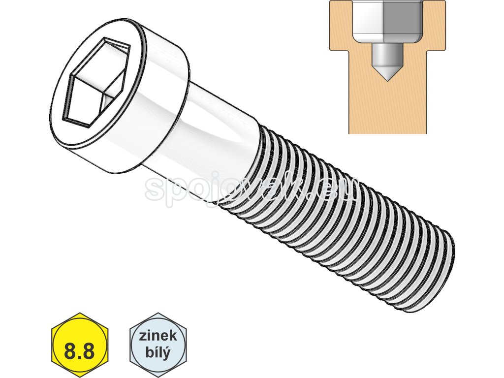Metrický šroub s nízkou válcovou hlavou, s vnitřním šestihranem a středovým otvorem (inbus).Ocelový šroub pevnosti 8.8. s povrchovou úpravou bílý zinek.