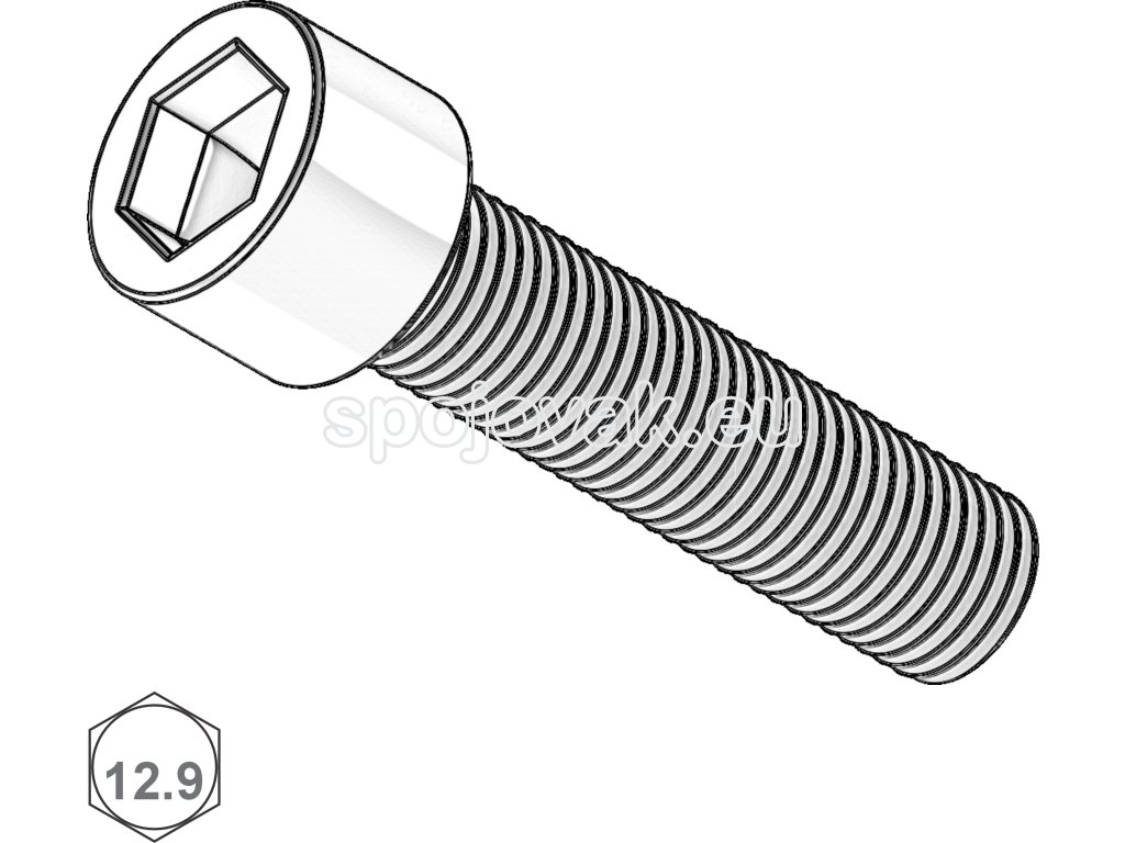 Metrický šroub s válcovou hlavou a s vnitřním šestihranem (inbus).Ocelový šroub pevnosti 12.9. bez povrchové úpravy. Jemný závit