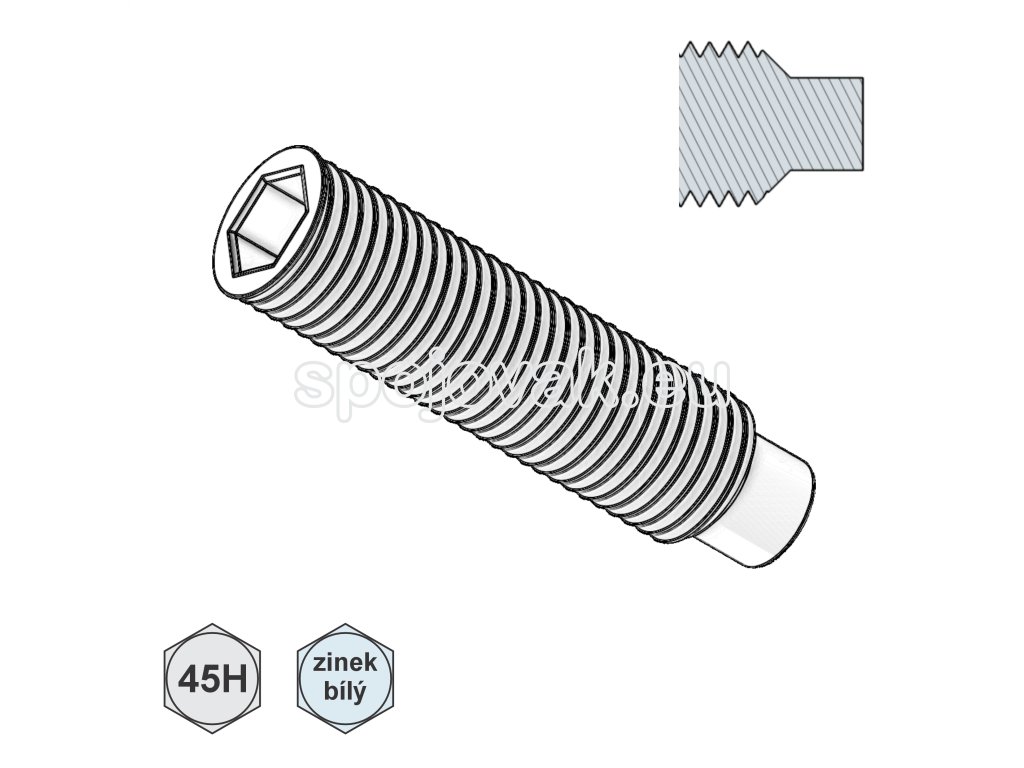 Šroub stavěcí s vnitřním šestihranem a čípkem, materiál ocel s vysokým obsahem uhlíku pevnosti 45H, s povrchovou úpravou v bílém zinku.