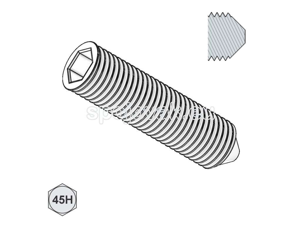 Šroub stavěcí s vnitřním šestihranem a hrotem, materiál ocel s vysokým obsahem uhlíku pevnosti 45H, bez povrchové úpravy.